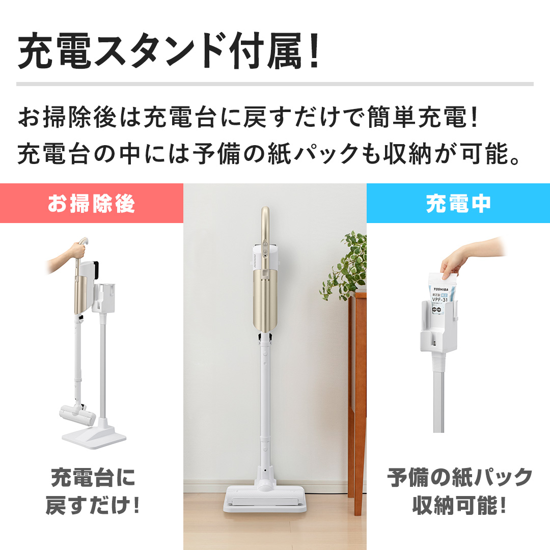 【充電スタンド付属!】お掃除後は充電台に戻すだけで簡単充電!充電台の中には予備の紙パックも収納が可能。