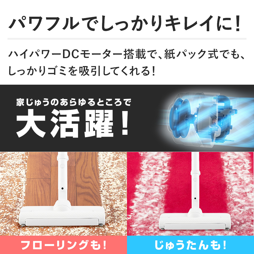 【パワフルでしっかりキレイに!】ハイパワーDCモーター搭載で、紙パック式でも、しっかりゴミを吸引してくれる!