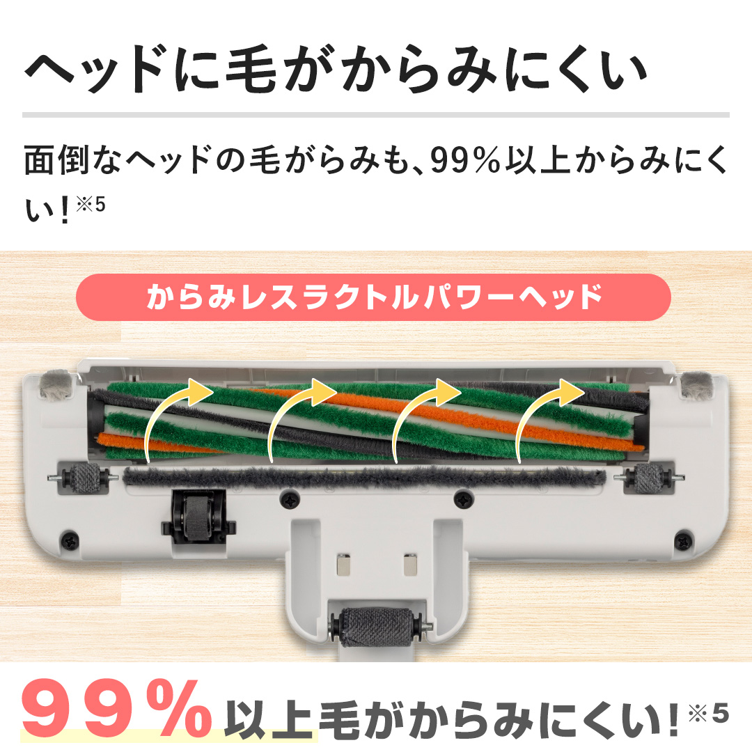 • ※5 試験方法:人毛(長さ25〜40cm)0.25gを3畳のフローリングにランダムに撒き、強運転で掃除機をかける。これを10サイクル行う。試験結果:回転部のブラシ毛へ絡みつく毛量が1サイクルにつき1%以下。