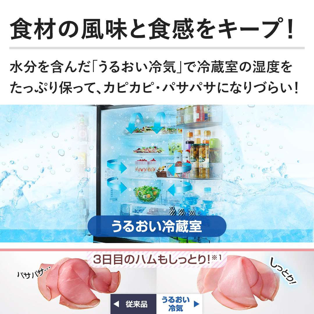 • ※1 2025年度シングル冷却商品GR-Y41GHとツイン冷却GR-A640XFSとの比較。ラップなし。ハムの水分減少率GR-Y41GH:59%、GR-A640XFS:15%