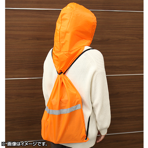 一体型フード付きで傘や帽子がないときに便利。雨風に強い撥水素材を採用しています。フード部分は厚くなっているので防災頭巾代わりにも。さらに、夜間も安心のリフレクター付きです。