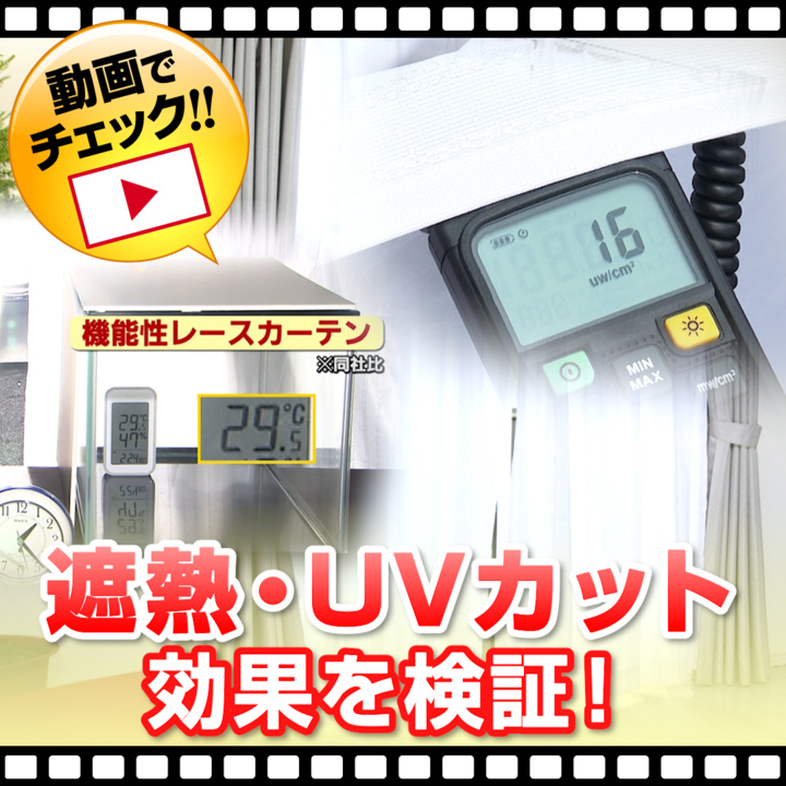 - ※2(一財)日本繊維製品品質技術センター調べ。約26℃に調整された約7uの実験室の窓へ投光機を照射、窓から約50p離れた位置に設置された椅子の30分後の温度上昇を、対象製品がある場合とメーカー比較品がある場合で計測し、その差を計算したもの。本商品を使用する事で、部屋の温度が下がるわけではありません。