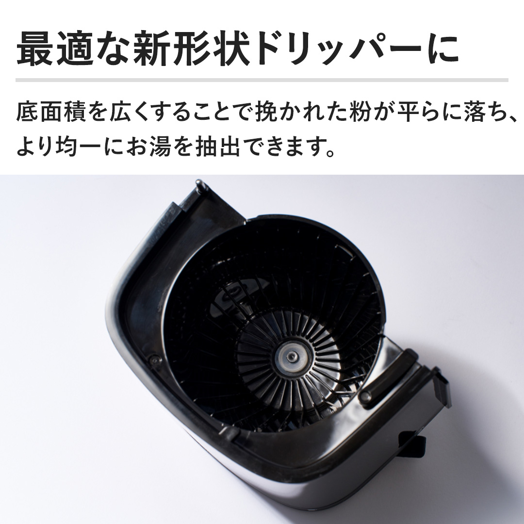 【最適な新形状ドリッパーに】底面積を広くすることで挽かれた粉が平らに落ち、より均一にお湯を抽出できます。
