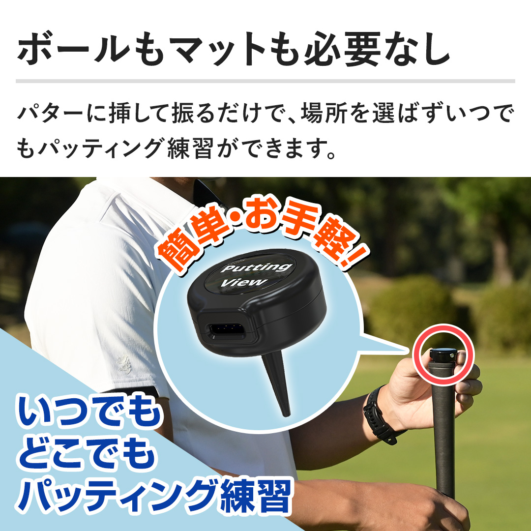 【ボールもマットも必要なし】パターに挿して振るだけで、場所を選ばずいつでもパッティング練習ができます。