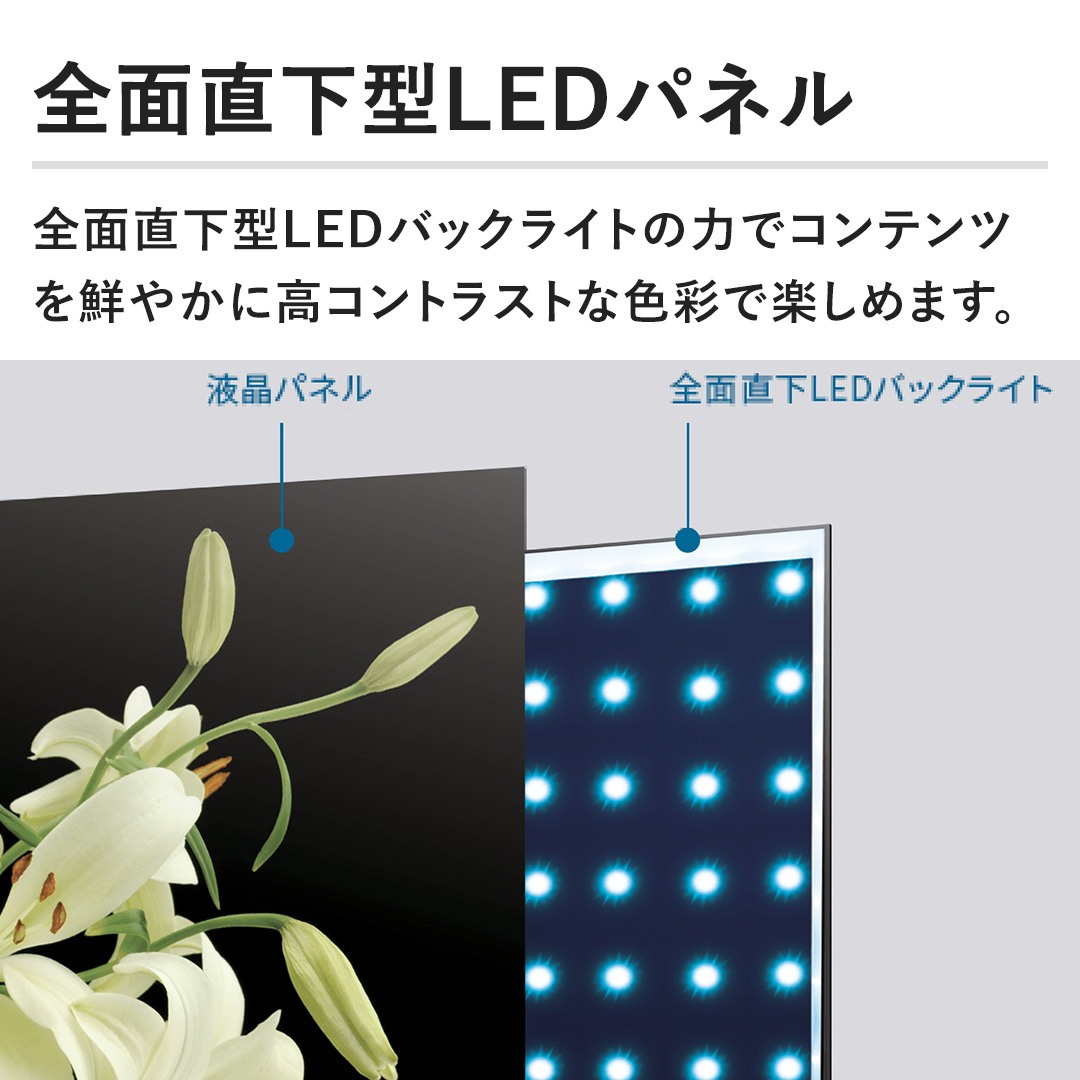 【全面直下型LEDパネル】全面直下型LEDバックライトの力でコンテンツを鮮やかに高コントラストな色彩で楽しめます。