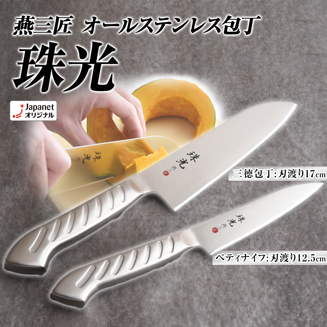 燕三条の職人が仕上げたというだけあって、三徳包丁もペティナイフも切れ味が良く、野菜・肉・果物までストレスなく切れました。刃渡りのバランスもよく普段使いに最適です。
