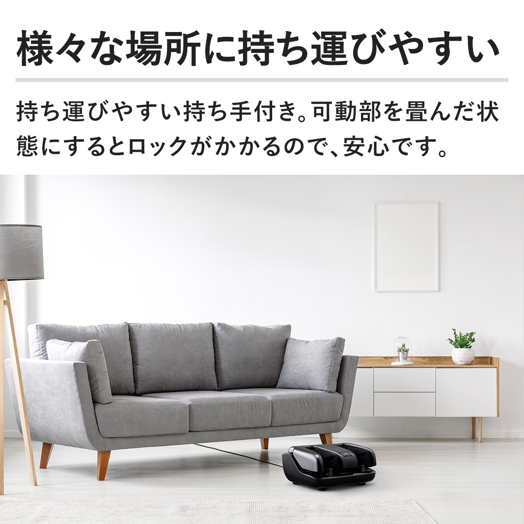 様々な場所に持ち運びやすい。持ち運びやすい持ち手付き。可動部を畳んだ状態にするとロックがかかるので、安心です。