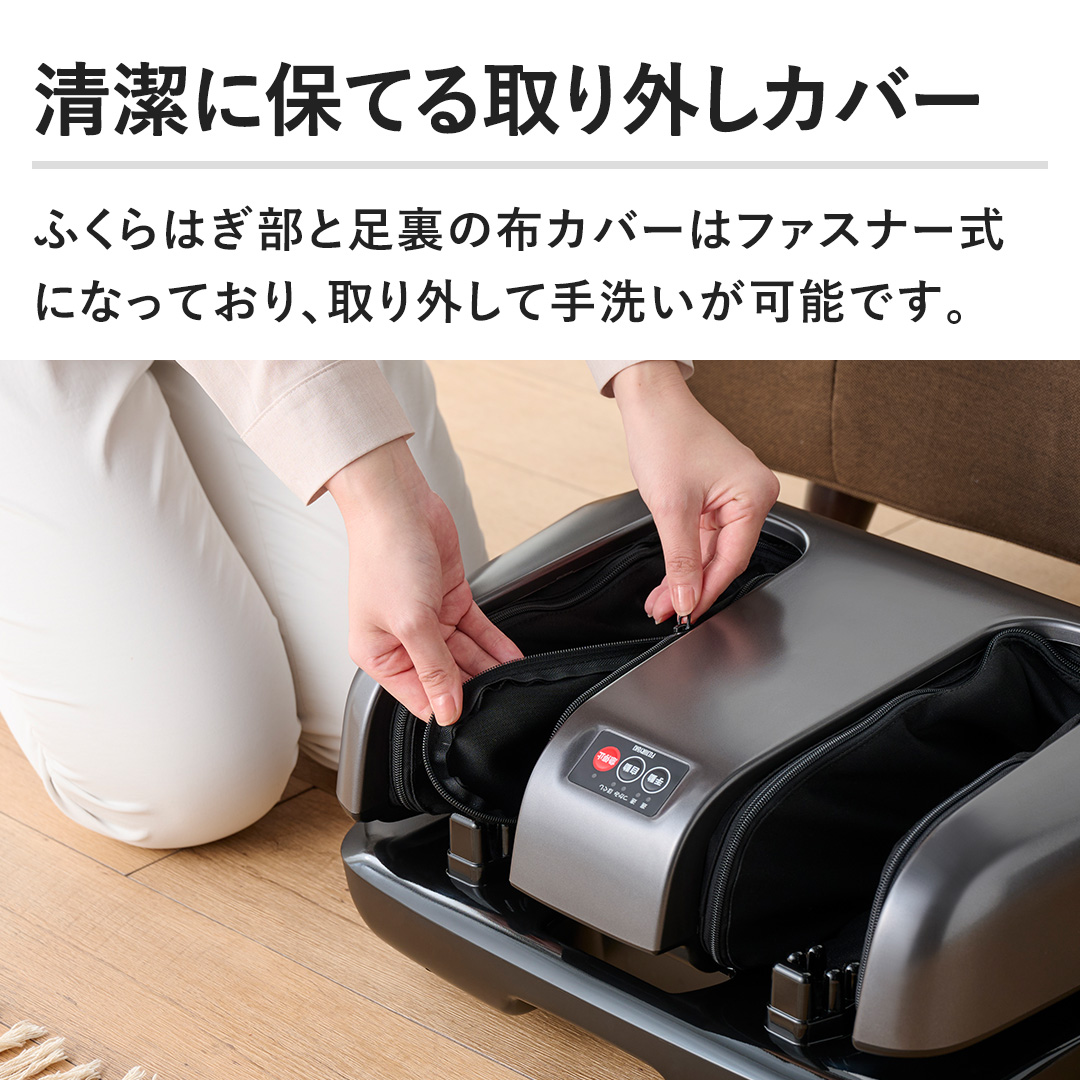 清潔に保てる取り外しカバー。ふくらはぎ部と足裏の布カバーはファスナー式になっており、取り外して手洗いが可能です。