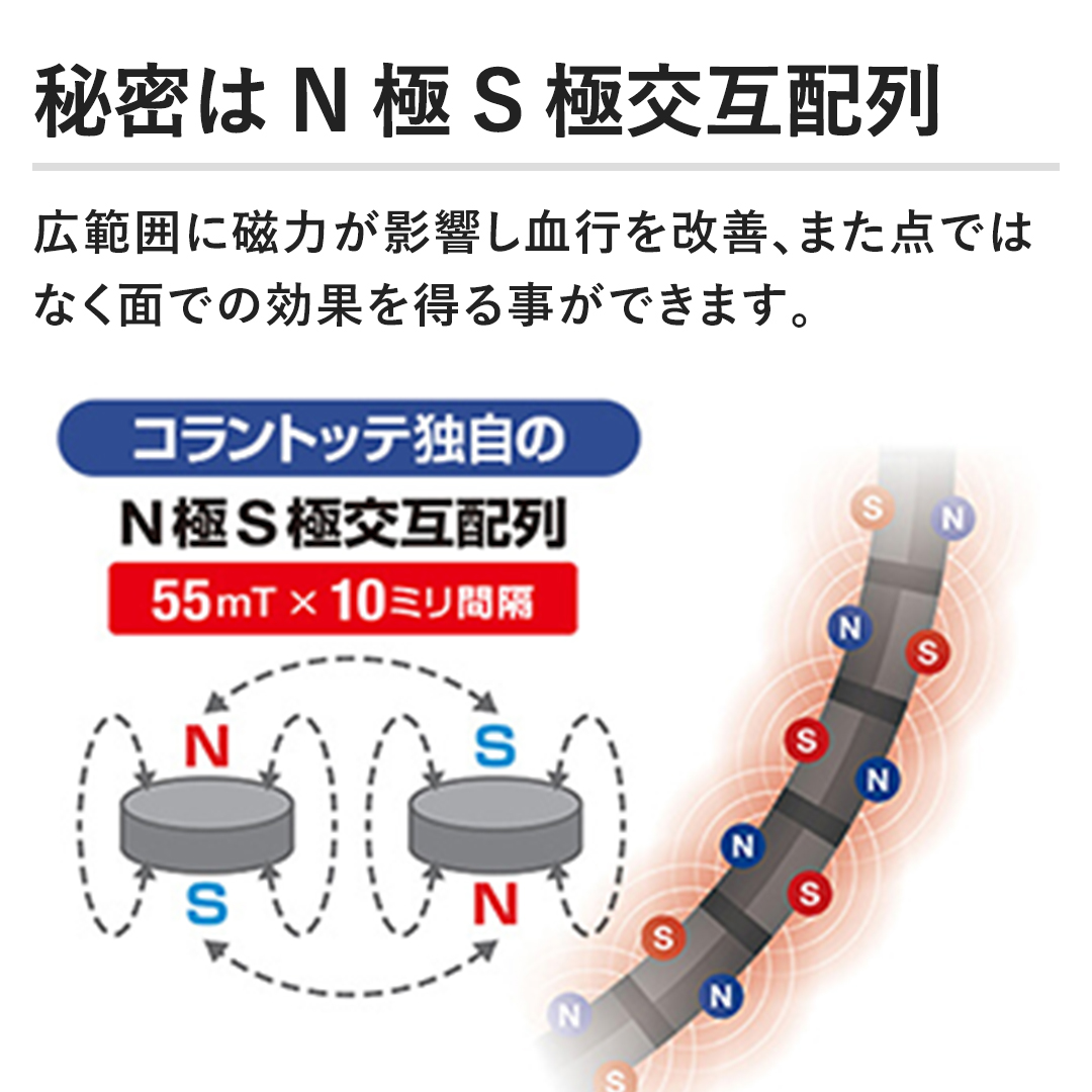 秘密はN極S極交互配列 広範囲に磁力が影響し血行を改善、また点ではなく面での効果を得る事ができます。