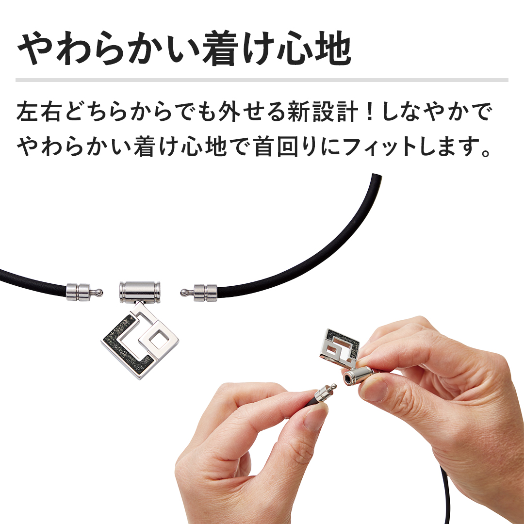 やわらかい着け心地左右どちらからでも外せる新設計でしなやかでやわらかい着け心地で首回りにフィットします。
