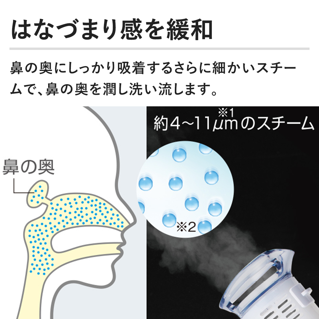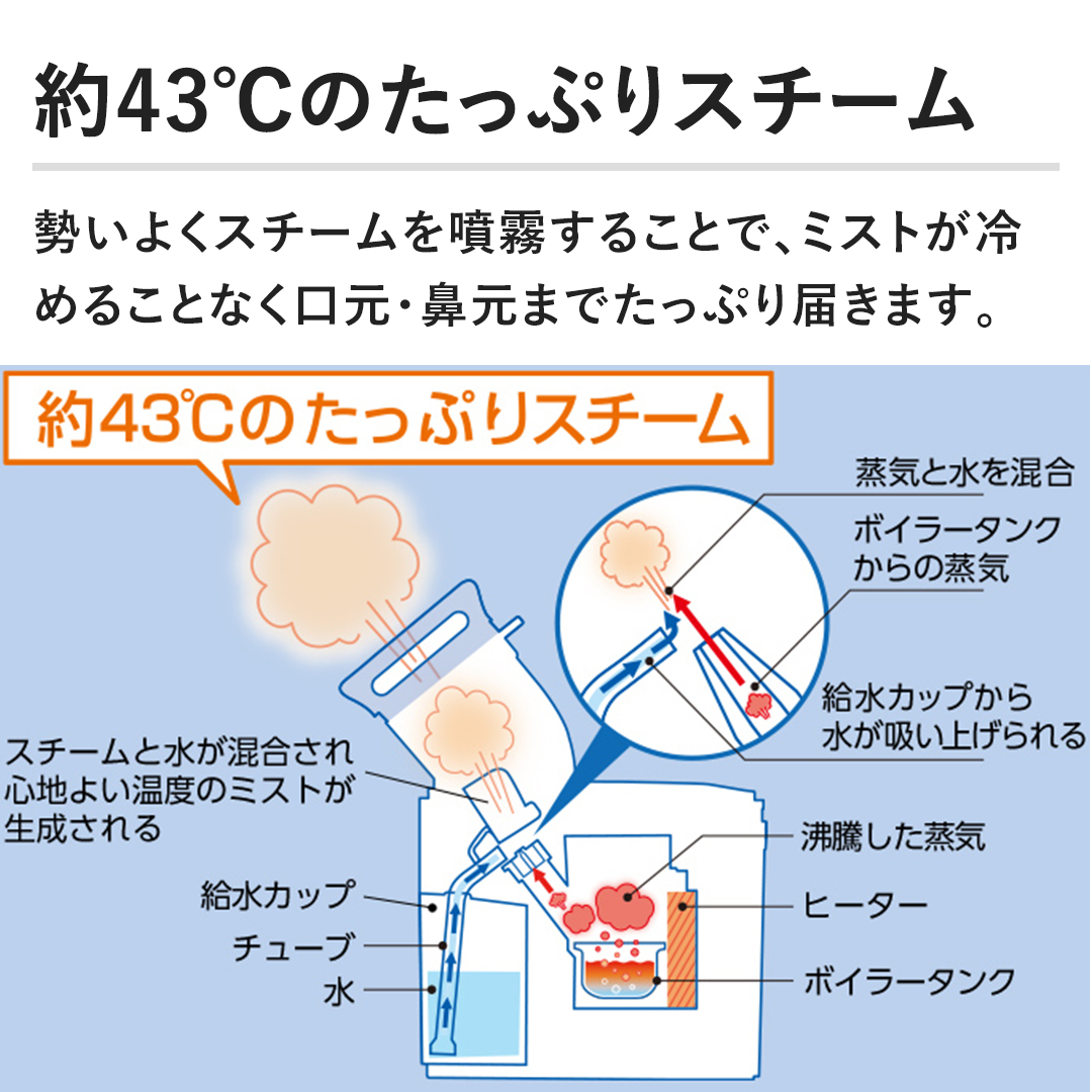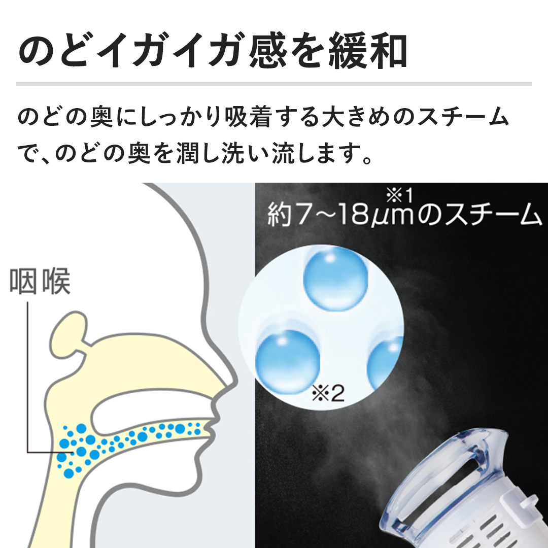 蒸気の程よい温かさでとても気持ちよく潤う。欠点は分解清掃の手間と、スイッチが少し硬い事。ト−タルで見て、性能は満点ですが使い勝手があと一歩な感じです。