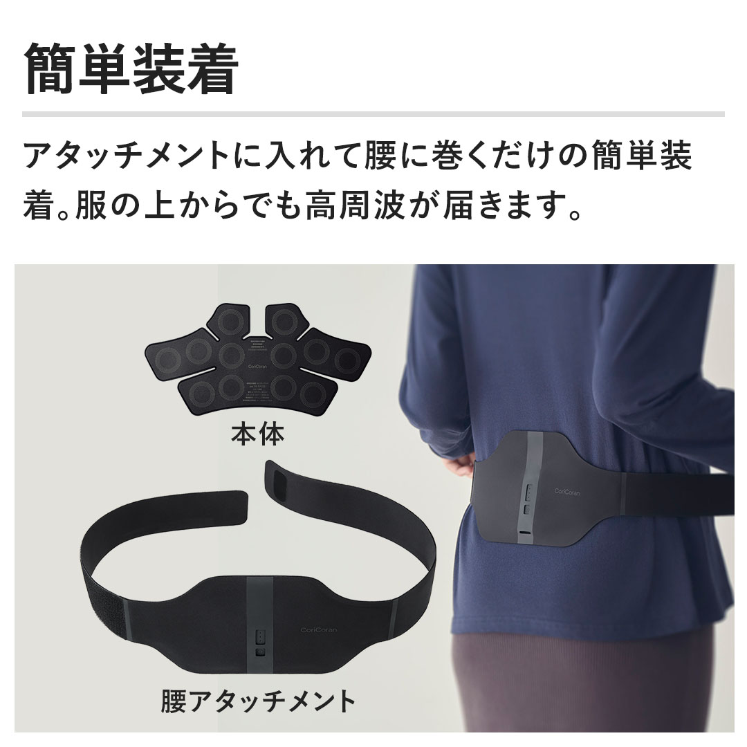 簡単装着 アタッチメントに入れて腰に巻くだけの簡単装着。服の上からでも高周波が届きます。