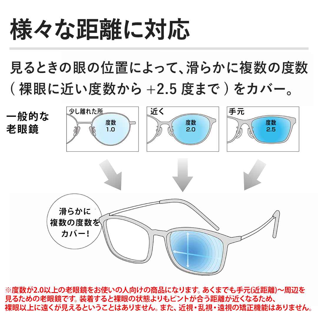 以前は近くを見る際に老眼鏡をかけてましたが、このメガネはかけっぱなしで近くも遠くもスッキリ見える。眼の角度には少しコツがいるが2日目には慣れました。そして軽いのが楽です。最高のメガネをゲットしました。