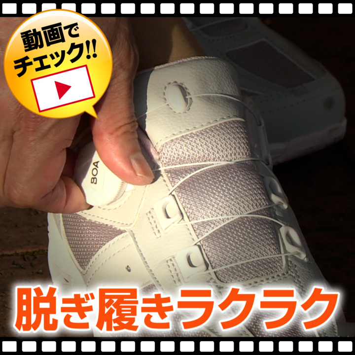 ・BOAダイヤルとは、ゴルフやスノーボードシューズなどで採用され、世界的に実績のあるダイヤルシステムです。締め具合もミリ単位で調節可能で、ダイヤルを引けば、ワイヤーが緩み、簡単に脱げます。