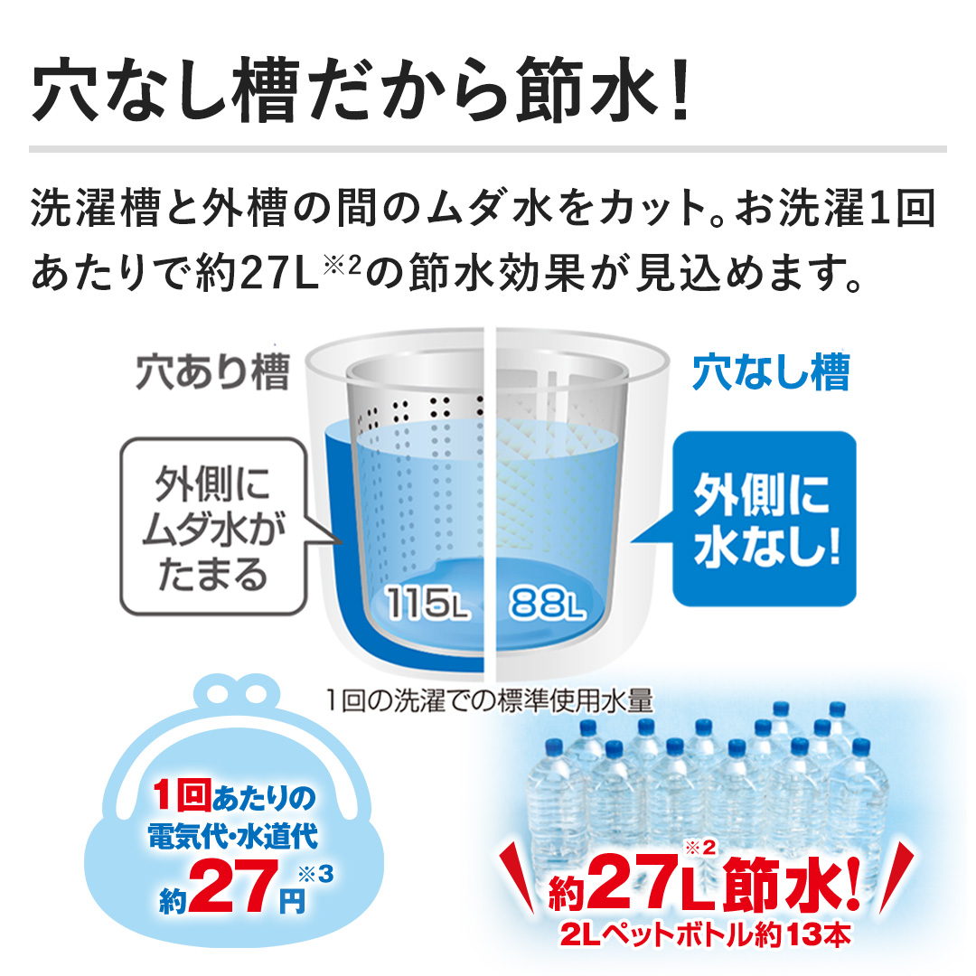 【穴なし槽だから節水!】洗濯槽と外槽の間のムダ水をカット。お洗濯1回あたりで約27Lの節水効果が見込めます。